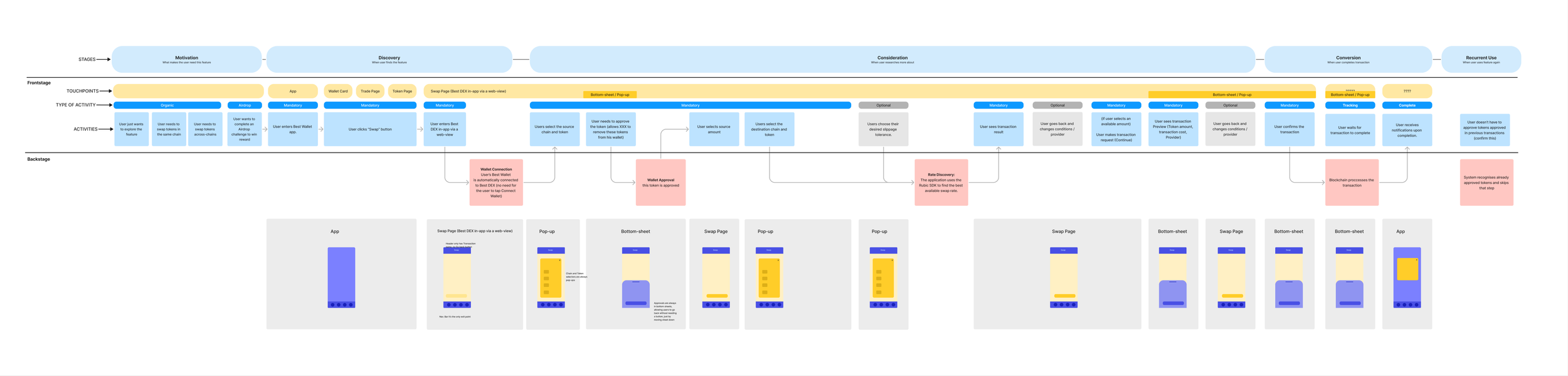 Based on the product’s technical brief, we created frontstage/backstage journey maps showing every step between the user interface and background blockchain processes.