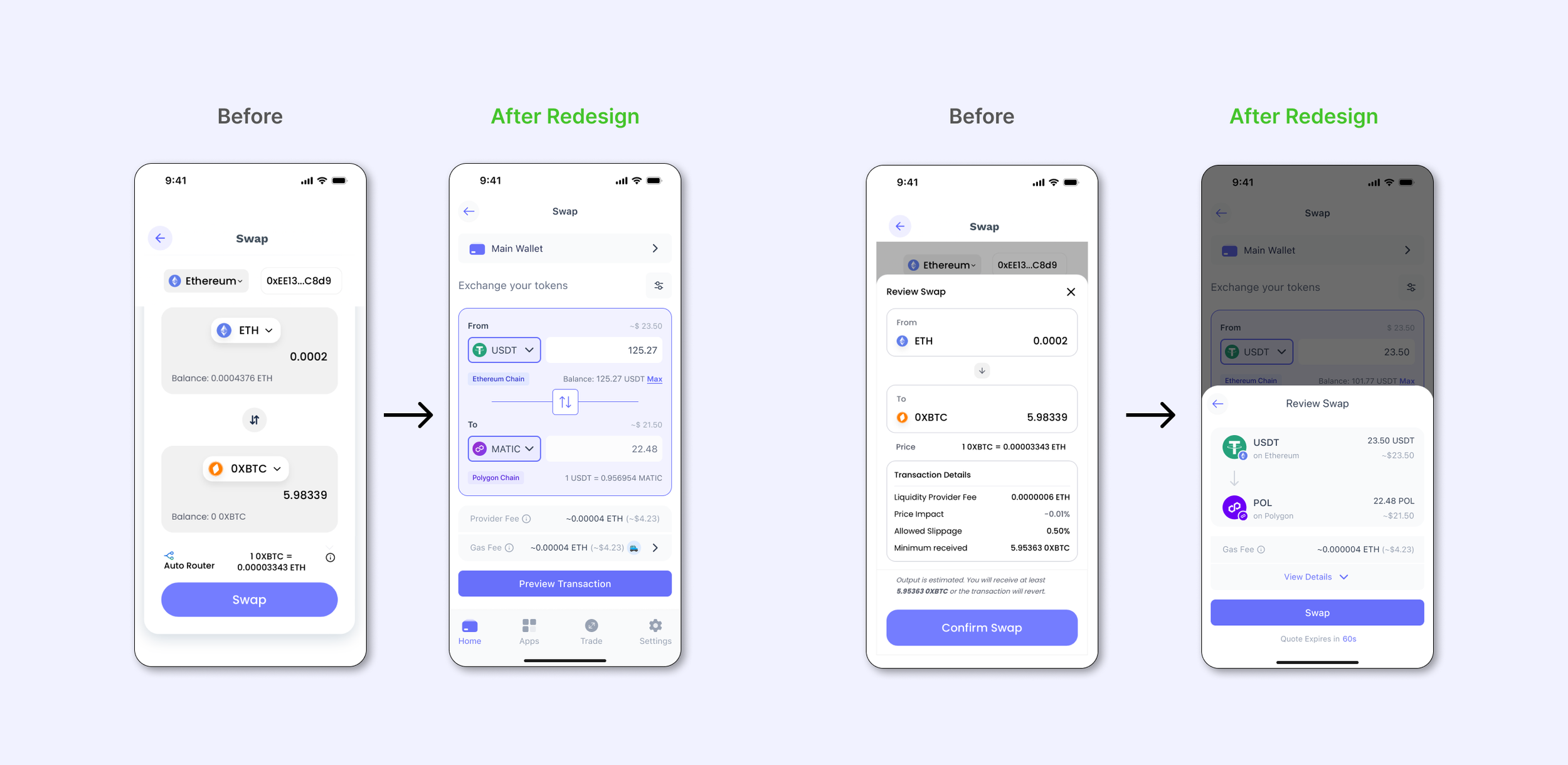Redesigned a legacy swap feature to support seamless cross-chain transactions within a multi-asset crypto wallet. Focused on simplifying complexity, improving reliability, and building user trust — especially for non-expert crypto users transacting in high-stress moments.